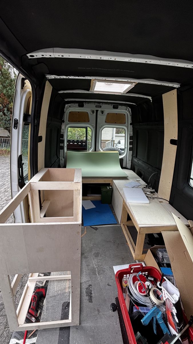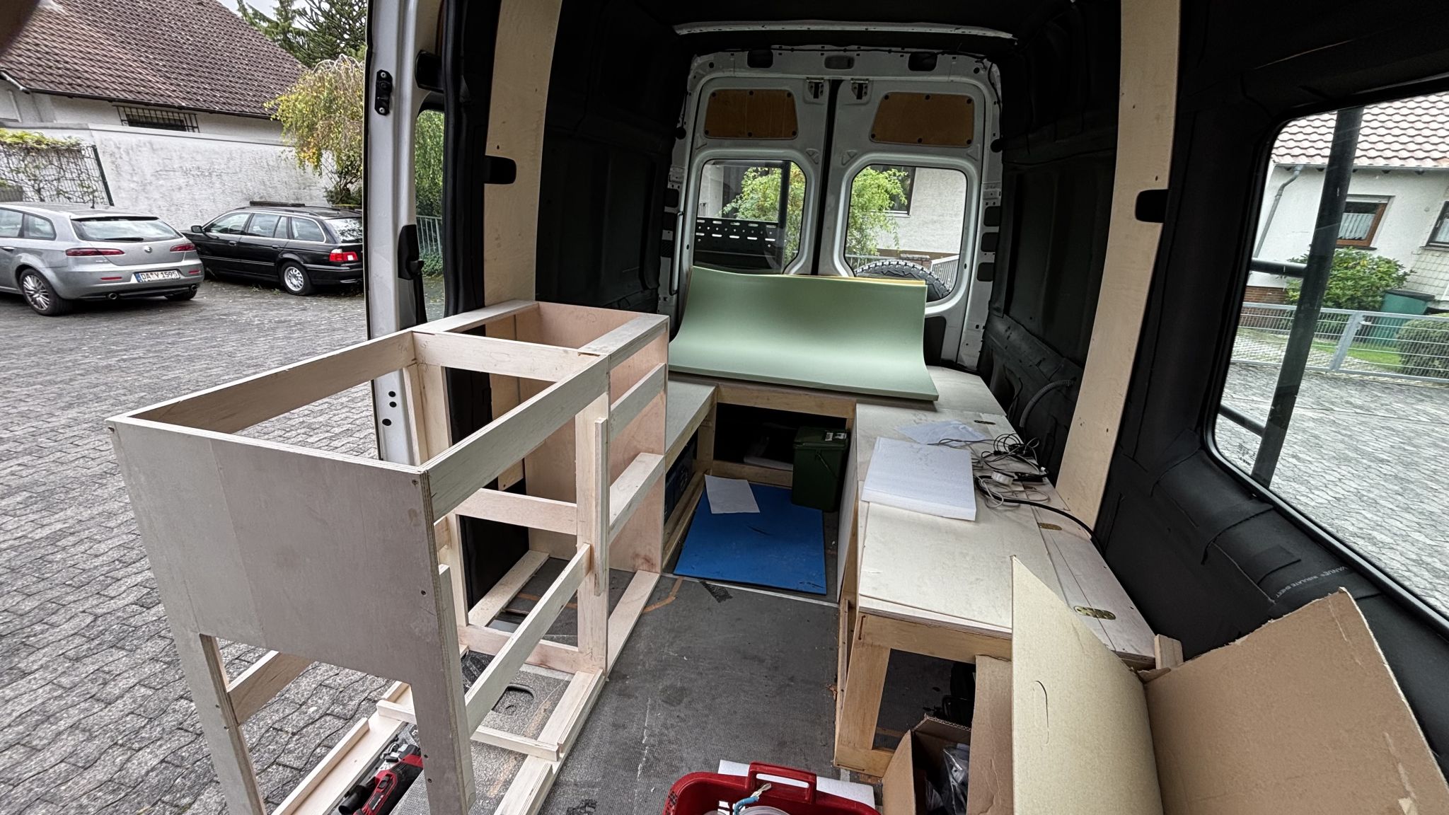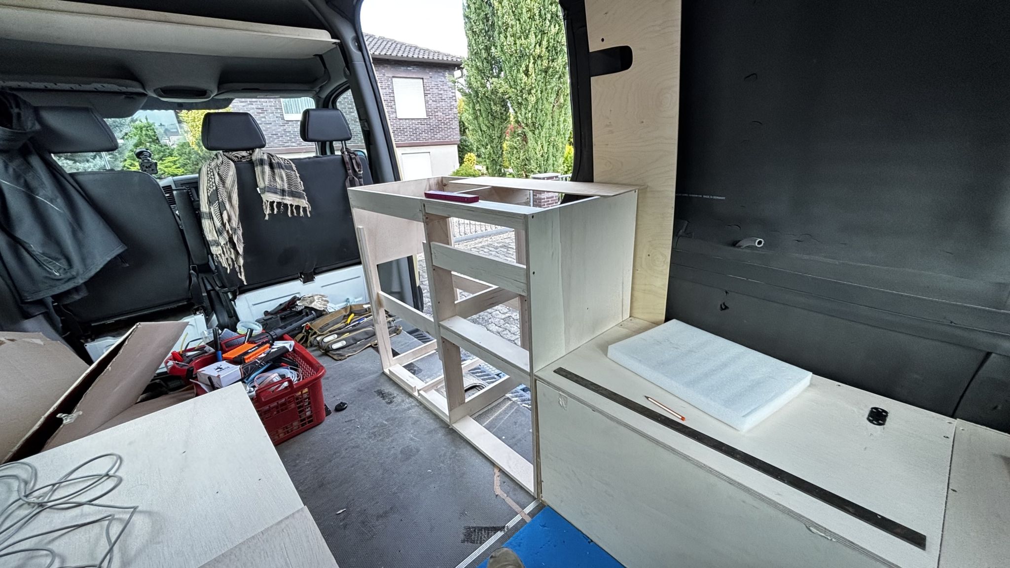 Aktuell wird die Küchenbox erstellt. Die Küchenbox ist 1,1 m lang und 50cm tief. Die reite ist erforderlich, weil der Kühlschrank seitlich in den Schrank eingebaut wird, so dass er von draußen wie von drinnen zu öffnen ist.]
