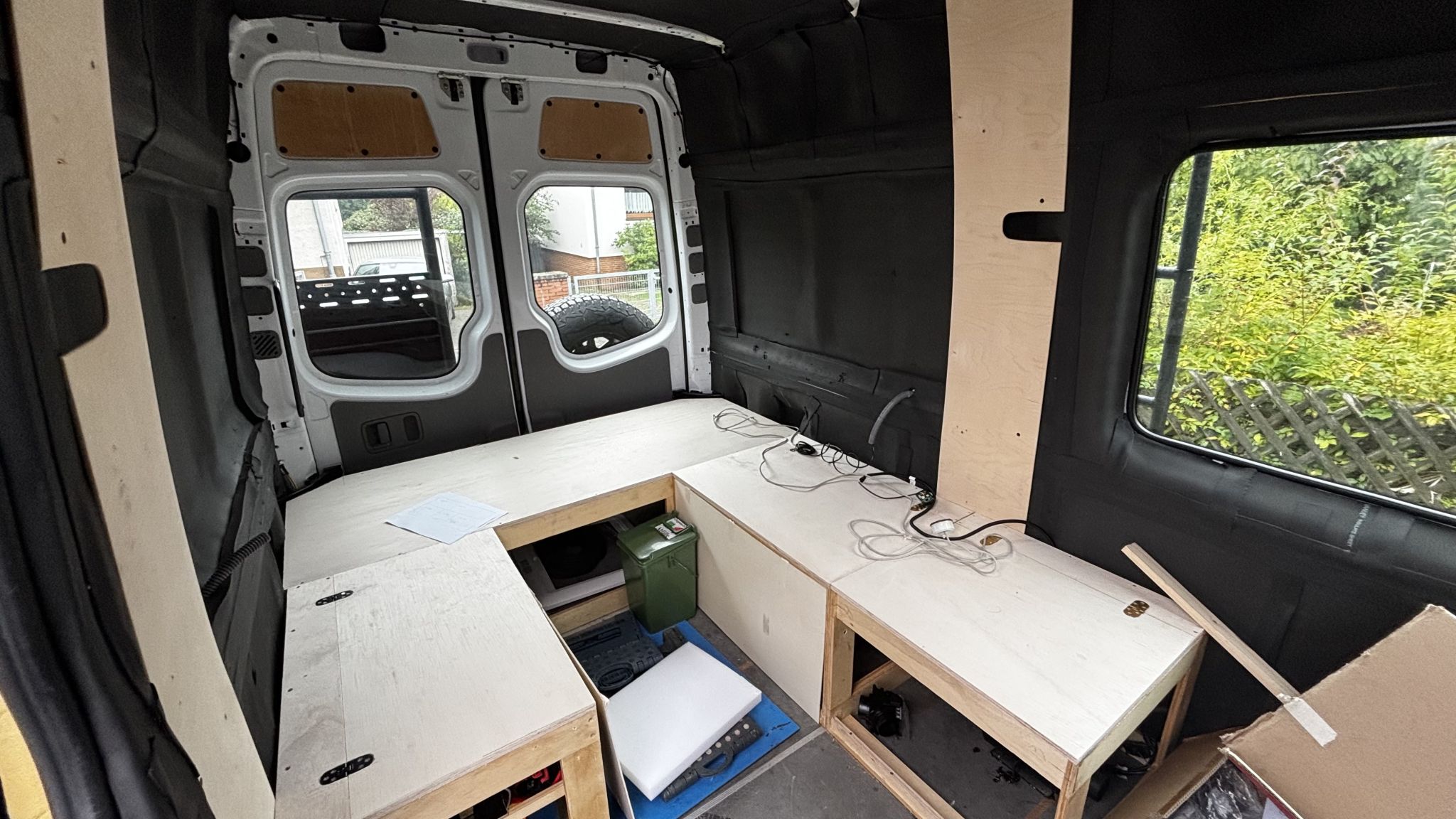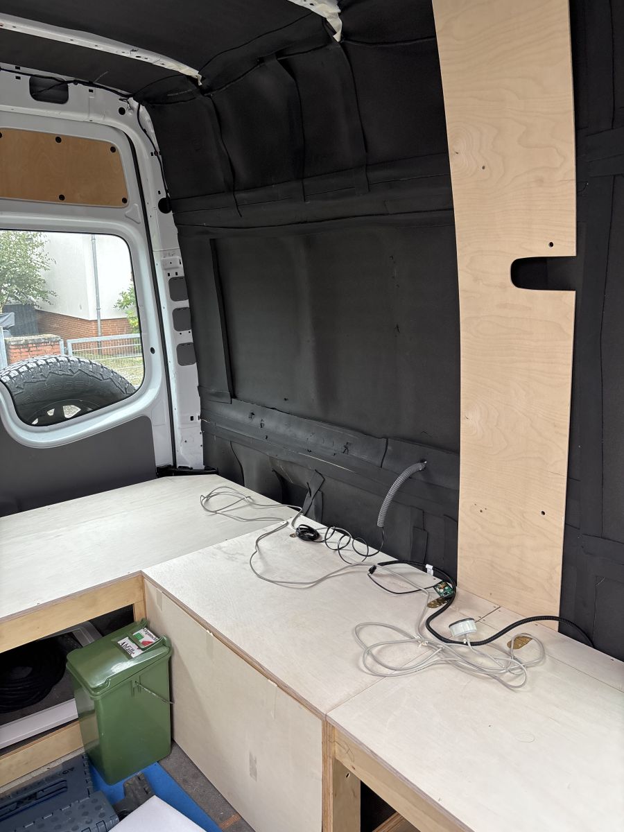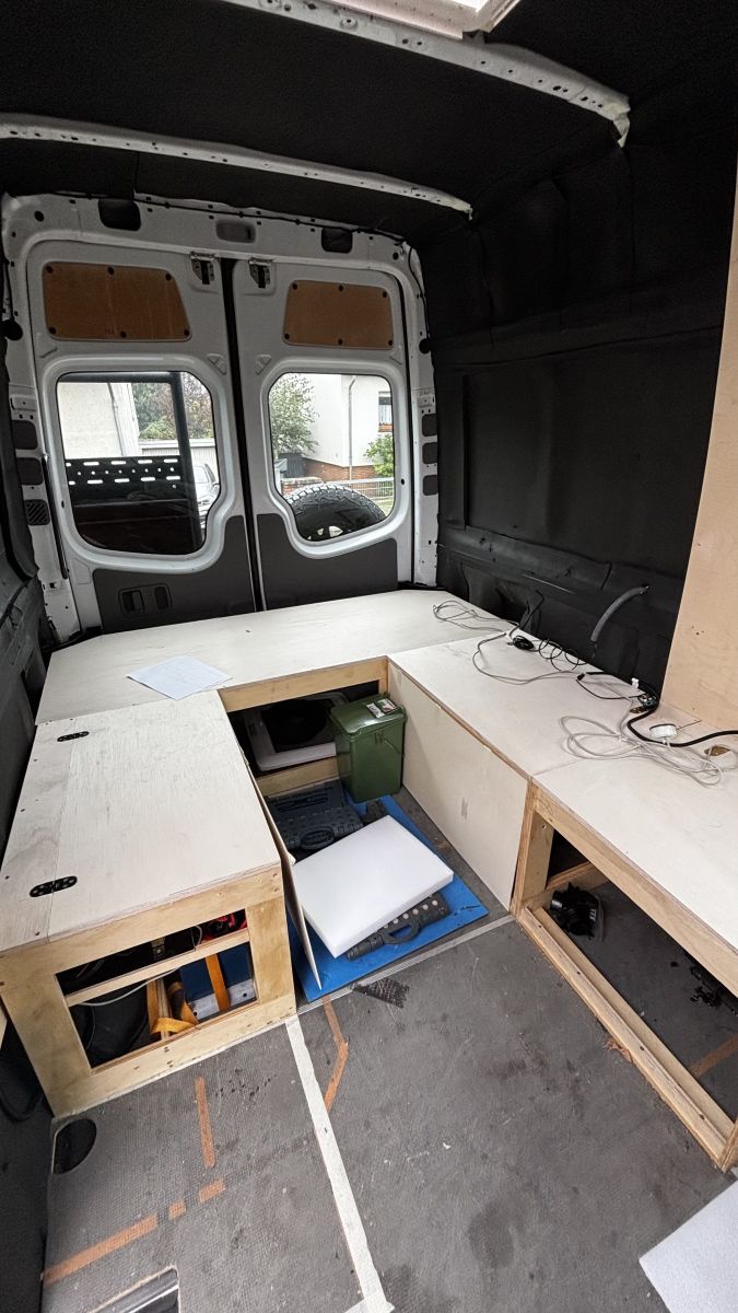 Aktuell wird die Küchenbox erstellt. Die Küchenbox ist 1,1 m lang und 50cm tief. Die reite ist erforderlich, weil der Kühlschrank seitlich in den Schrank eingebaut wird, so dass er von draußen wie von drinnen zu öffnen ist.]