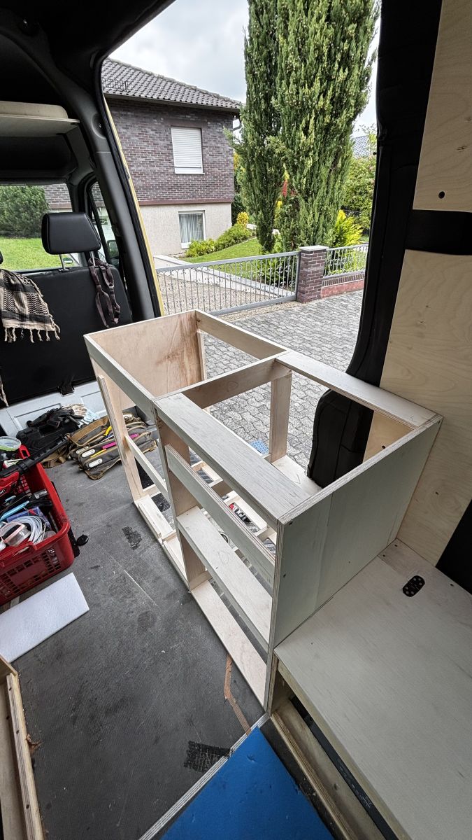Auf dem linken Teil des Schranks ist die Spüle unter gebracht. Der Abwassertank liegt unter der Spüle auf dem Boden. Dazwischen wird eine Schublade eingebaut.