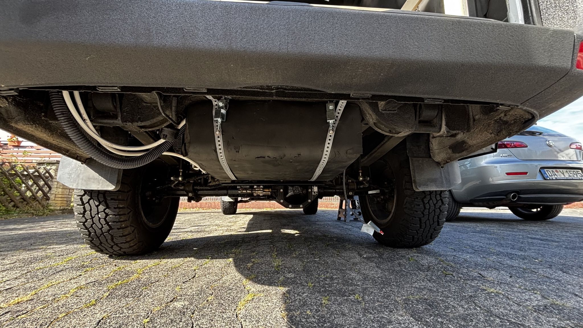 Die Schläuche werden noch an der Karosserie fixiert und das Kabel auf der rechten Seite gehört zur Tankheizung. Das wird mit einem Stecker verbunden und durch den Boden zum Elektroboard geführt.