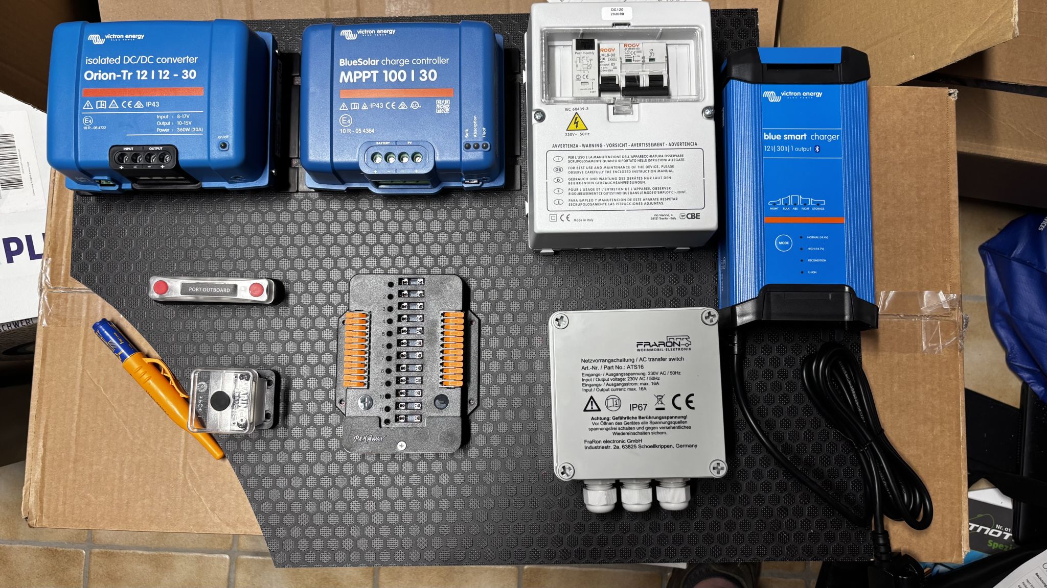 Das Board mit den Elektrokomponenten ist auch bereits in Arbeit. Was auf dem Board fehlt, ist der Wechselrichter, der kommt an einen anderen Platz. Das Board kommt auf die Beifahrerseite in den hinteren Teil., dort wo der Elekrtroanschluß für den Landstrom montiert wurde. So kann ich jederzeit an die Komponenten ran, wenn es nötig ist.