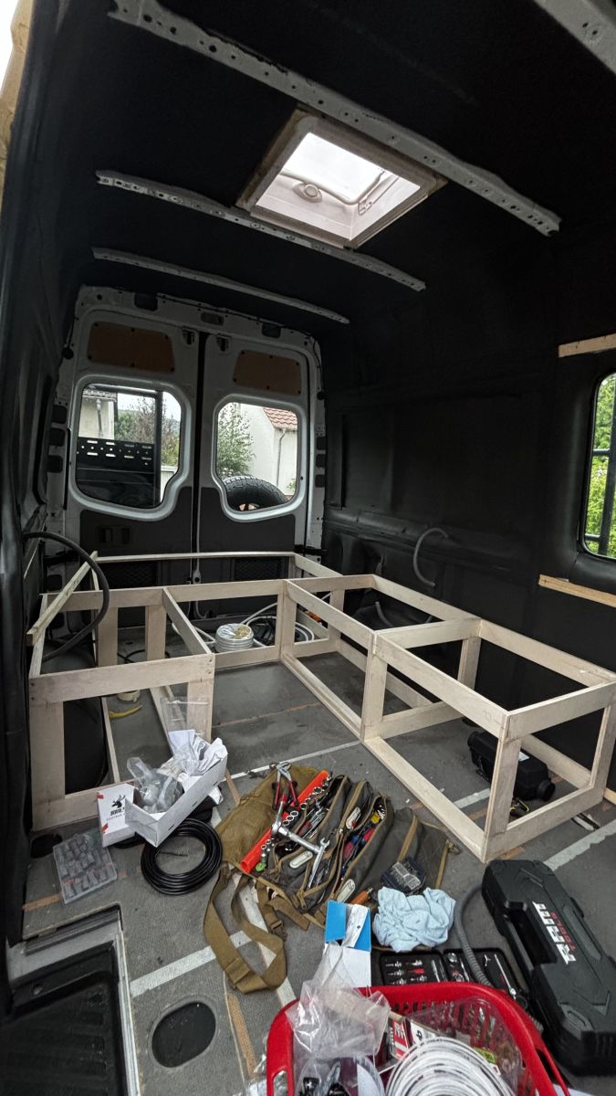 Nach der Verlegung der Infrastruktur werden die Wände und die Decke verkleidet. Die Verkleidung wird mit 4mm EpicPLY gemacht, welches mit Filz beklebt wird.